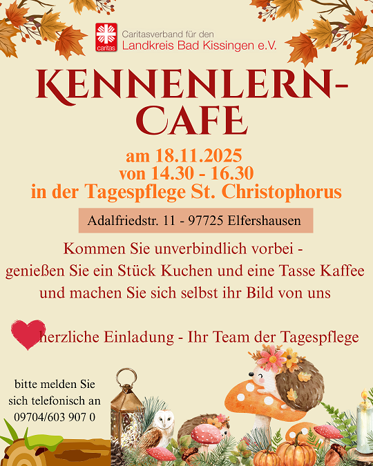 Die Tagespflege St. Christophorus in Elfershausen läd herzlich zum Tag der offenen Tür ein! Am 18. November 2025 ab 14:30 Uhr Bei Kaffee und Kuchen können Interessierte sich ein Bild machen und sich beraten lassen. Anmeldung unter Tel. 09704/6039070 ist erwünscht.